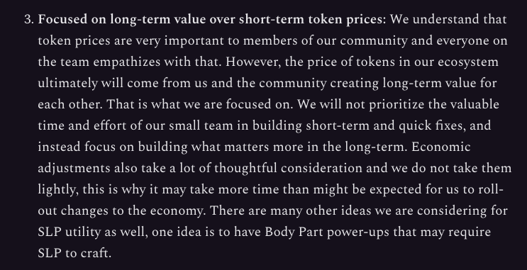 In the image above, the team listed out all the considerations they make before implementing changes to the $SLP mint and burn rate. It is not as simple as people make it out to be. Balancing an economy has consequences that, if not taken into consideration, can provide real harm to the overall economic system (see what is going on with inflation right now). In a response to this, I wrote the tweet below: