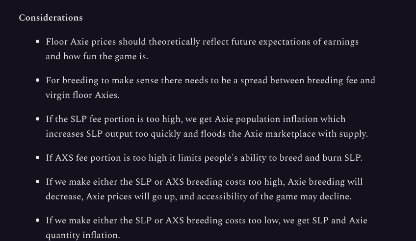 There is a current subset of players, though, that think the team is responsible for making the price of $SLP go up, as people now depend on it for a source of income. While I respect, and understand the concerns of those that play the game as a source of income, I think the focus should instead be on the fact that they are able to earn, not on the amount that they are able to earn. Creating value from 0 -> 1 is not easy, especially in an infant industry where everything is new, and nothing has been built before. People are now able to play a fun game, a couple hours a day, and earn money from playing. This, in and of itself, is revolutionary, as the current gaming model makes you spend $60 on a new game every year with a 100% take rate and no secondary market to sell, or even own, anything you do in game. What we are seeing now is something that has never been done before, and will take iterations to get right over time. While creating other burn mechanisms for $SLP may seem trivial, changing the issuance rate of $SLP is non trivial.